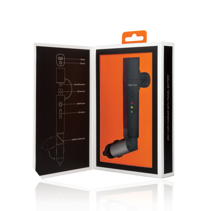 Både billaddare och portabelt batteri i ett, mycket smart lösning. Ladda din telefon i bilen och ta med batteriet för att fortsätta ladda.